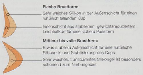 TechnologieKombination aus zwei unterschiedlichen Silikonschichten (patentiertes Zweischichtkonzept) für ein natürliches Bewegungsverhalten und Aussehen der Brustprothese. Prothesen für die flache Brustform mit weicher Außenschicht und einer stabilen Innenschicht. Prothesen mit stabilerer Außenschicht und weicher Innenschicht für mittlere bis volle Brustform.