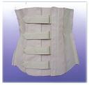 Die Leibbinde ist eine teilelastische Konstruktion aus Drell und Futterstoff mit dorsaler Schnürung, ventraler Unterstützungslasche und Gurten, ohne Gegenhalt durch feste Stäbe.